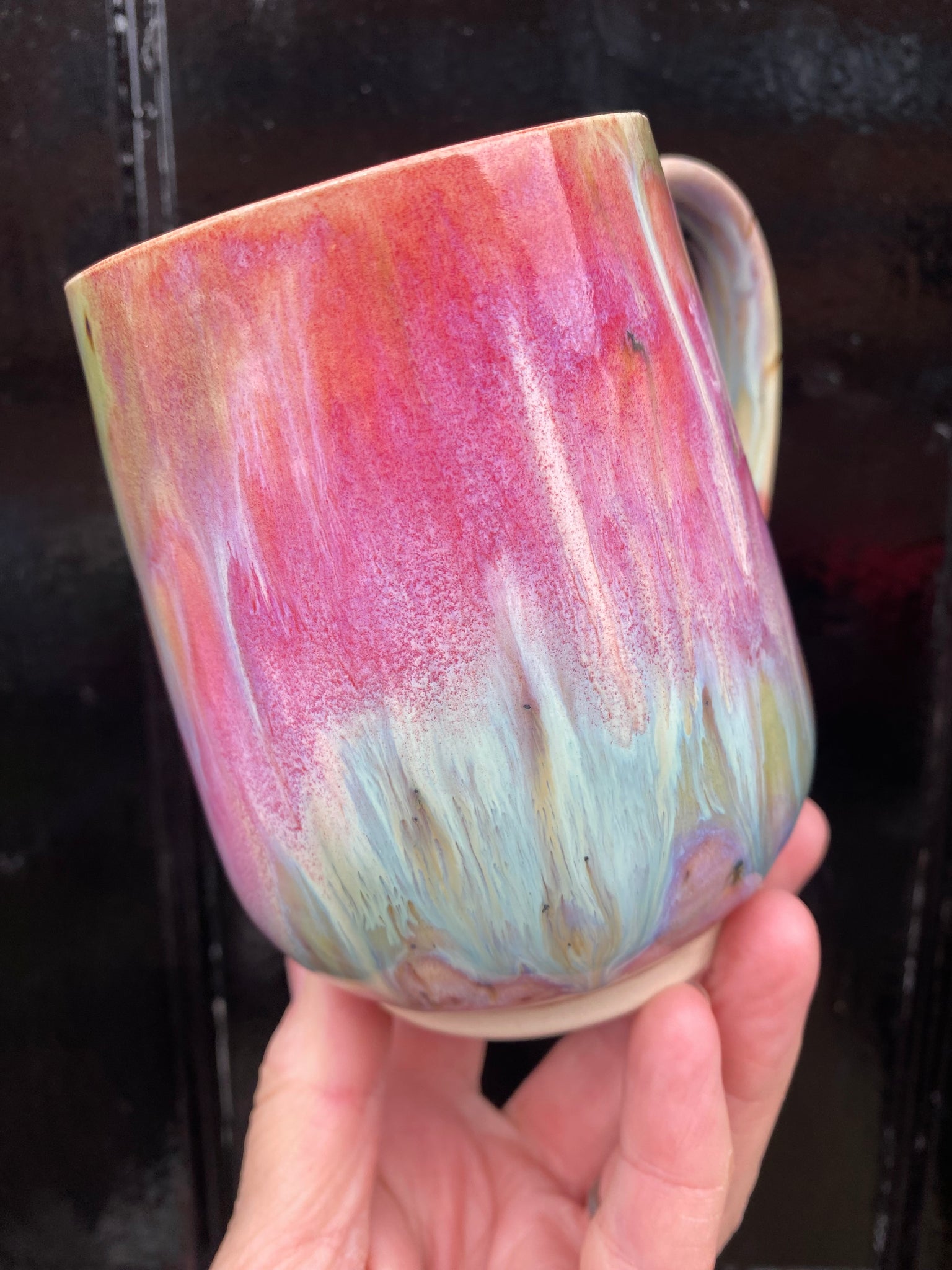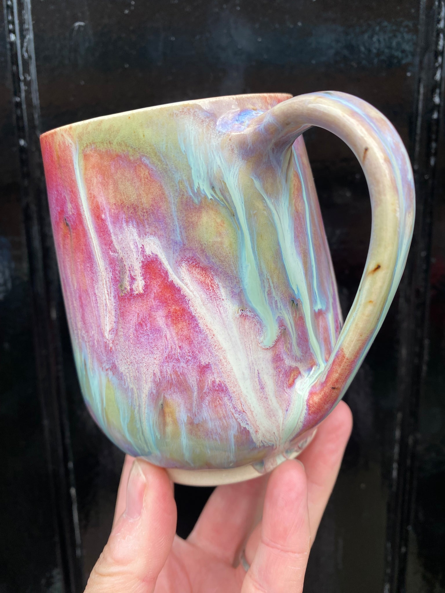 Thrown on my pottery wheel in stoneware this mug is glazed in a a pretty combination of colours. When filled to the brim holds 380ml